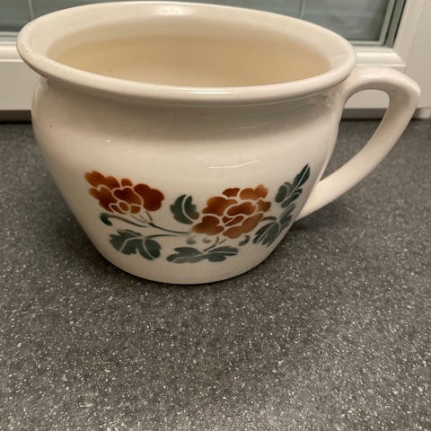 Arabian potta. Kuvassa näkyy astian reunassa osuma. Muutoin ehjä ja hyväkuntoinen.
