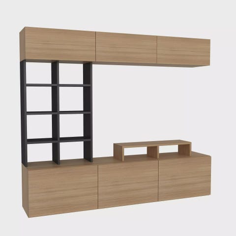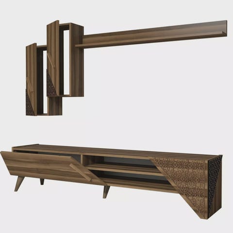 Muuttaa asuintilasi modernin ja uudenlaisen tv-yksikön avullaOletko kyllästynyt tylsään ja vanhentuneeseen olohuoneeseesi? on aika uudistaa tilasi upealla tv-yksiköllämme. Modernilla ja uutuuskonseptilla suunniteltu tv-yksikkö nostaa välittömästi olohuoneesi tyyliä ja tunnelmaa. Voittava laatu ja kestävyysTämä 100-prosenttisesti melamiinipinnoitetusta lastulevystä valmistettu tv-yksikkö on rakennettu kestämään. Sen 18 mm:n paksuus takaa poikkeuksellisen lujuuden ja vakauden, mikä tekee siitä luotettavan lisäyksen kotiisi. Runsas säilytystilaSano hyvästit sotkuisille olohuoneille! tv-yksikössämme on lukuisia hyllyjä, jotka tarjoavat runsaasti säilytystilaa kaikille medialaitteillesi, dvd-levyille ja muille tärkeille tavaroille. Pidä tilasi järjestyksessä ja siistinä samalla, kun esittelet suosikkisisustuksesi seinähyllyillä. Monipuolinen muotoiluTämä tv-yksikkö ei ole vain esteettisesti miellyttävä, vaan myös erittäin toimiva. Se voidaan helposti kiinnittää seinään, mikä säästää arvokasta lattiatilaa ja luo tyylikkään ja virtaviivaisen ilmeen. Mustan ja teakin väriyhdistelmä tuo ripauksen eleganssia ja hienostuneisuutta minkä tahansa huoneen sisustukseen. Tekniset tiedot:Materiaali: 100 % melamiinipinnoitettu lastulevyPaksuus: 18mmTV-telineen koko: cm, korkeus: 47 cm, syvyys: 37. 5 cm.Seinähylly Koko: Seinähylly: 1,5 mm: cm, korkeus: 80 cm, syvyys: 21. 8 cm (2 kpl).Väri: Musta ja teakKonsepti: Teak: Moderni - Uutuus