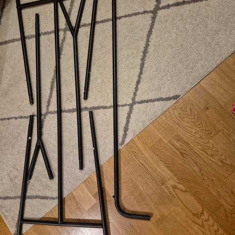 Jysk vaaterekki puinen runko ja musta ritilähylly. Yläosassa vaakasuora tanko vaatteiden ripustamiseen henkareilla. Alaosassa mustista puusäleistä koostuva hylly kengille. Soveltuu eteiseen, makuuhuoneeseen tai vaatehuoneeseen lisäsäilytystilaksi vaatteille ja asusteille.