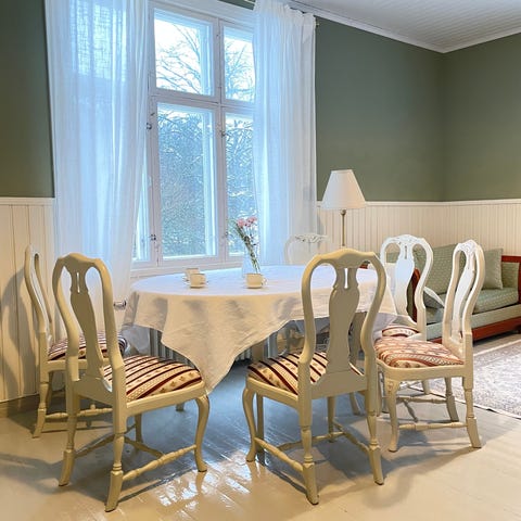 Pöytä ja kuusi tuolia sekä lasivitriini, tuolit vasta verhoiltu roosaraitaisella Amadeus-kankaalla. Iän tuomaa kulumaa hiukan, mutta tuolit ovat tukevat, eivät nitku. Myyn kokonaisuutena. Laitala.