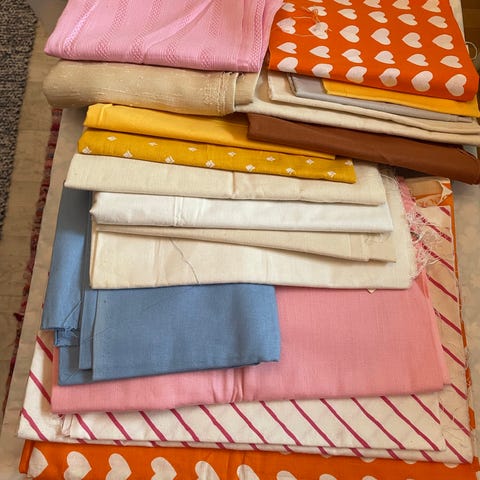 Iso määrä (pyykkikorillinen) reilunkokoisia paloja, pellavaa ja puuvillaa monenlaisiin ompeluihin.