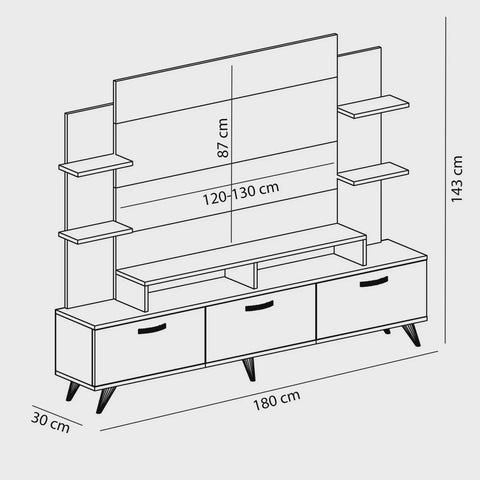 Muuttaa asuintilasi modernilla ja tyylikkäällä tv-yksikölläParanna olohuoneesi kauneutta hienolla tv-yksiköllämme. Tämä äärimmäisen tarkasti valmistettu tv-yksikkö on suunniteltu lisäämään tilaan ripauksen eleganssia ja hienostuneisuutta. Sen moderni ja uutuuskonsepti nostaa välittömästi kotisi yleistä estetiikkaa. Runsas säilytystila kaikille viihdetarpeillesi Lukuisilla hyllyillä ja lisäsäilytystiloilla varustettu tv-yksikkö tarjoaa runsaasti tilaa medialaitteiden, dvd-levyjen, kirjojen ja muiden tavaroiden järjestämiseen. Sano hyvästit sotkuisuudelle ja nauti siististä ja järjestetystä olohuoneesta. Luo upea keskipiste kotiisi.Pähkinäpuun ja valkoisen värin täydellisessä sekoituksessa tämä tv-yksikkö on visuaalinen herkku. Kontrastivärit tuovat nykyaikaisen kosketuksen olohuoneeseesi, mikä tekee siitä täydellisen keskipisteen kotiisi. Kestävä ja pitkäikäinen rakenneTämä 100 % melamiinipinnoitetusta lastulevystä valmistettu tv-yksikkö on rakennettu kestämään. Sen 18 mm:n paksuus takaa kestävyyden ja vakauden, jolloin saat luotettavan huonekalun, joka kestää aikaa. Helppo asennus ja monipuolinen muotoiluTämä tv-yksikkö voidaan kiinnittää helposti seinään, mikä säästää arvokasta lattiatilaa. Sen monipuolisen muotoilun ansiosta voit sijoittaa sen mihin tahansa huoneen nurkkaan, joten se sopii täydellisesti mihin tahansa sisustukseen. Tekniset tiedot:Materiaali: 100 % melamiinipinnoitettu lastulevyPaksuus: 18 mmTV-yksikön koko: Laitteen koko: Leveys: 180 cm, Korkeus: 148 cm. 6 cm, syvyys: 29. 5 cmSivuhyllyn leveys: 29. 6 cm.TV-hyllyn leveys: 120 cmVäri: Pähkinä ja valkoinenKonsepti: Nykyaikainen - Uutuus