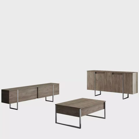 Muuttaa olohuoneesi tämän upean kalustesarjan avullaPäivitä olohuoneesi tällä hienolla huonekalusarjalla, joka kohottaa välittömästi tilasi tyyliä ja tunnelmaa. Tämä äärimmäisen tarkasti ja yksityiskohtiin kiinnitetty olohuoneen kalustesarja on suunniteltu tekemään vaikutuksen. Kokeile vertaansa vailla olevaa tyylikkyyttä ja kestävyyttä Tämä 100-prosenttisesti melamiinipinnoitetusta lastulevystä valmistettu kalustesarja on poikkeuksellisen kestävä ja pitkäikäinen. 18 mm:n paksuus takaa tukevuuden, joten voit nauttia kalusteistasi vuosien ajan. Tyylikkäät metallijalat tuovat ripauksen modernia ja hienostuneisuutta, mikä tekee tästä sarjasta todellisen statement-kappaleen mihin tahansa huoneeseen. Täydellisen kokoinen mukavuuden vuoksiTelevisioteline tarjoaa runsaan 180 cm:n leveytensä ansiosta runsaasti tilaa televisiollesi ja viihdelaitteillesi. Konsoli, jonka leveys on 150 cm, tarjoaa runsaasti säilytystilaa mediatarvikkeille. Sohvapöytä, jonka mitat ovat 90cm x 40cm x 60cm, on täydellinen olohuoneen keskipiste, joka tarjoaa kätevän pinnan juomille, välipaloille ja sisustukselle. Tarjoa sisustuksellesi ajattoman mustaa.Tässä kalustesarjassa on tyylikäs musta väri, joka tuo olohuoneeseesi ripauksen eleganssia ja hienostuneisuutta. Musta sävy täydentää vaivattomasti mitä tahansa olemassa olevaa sisustusta tai värimaailmaa, joten se on monipuolinen valinta mihin tahansa kotiin. Tekniset tiedot:Materiaali: Materiaali: 100 % melamiinipinnoitettu lastulevyPaksuus: 18mmJalat: .TV-telineen mitat: Korkeus: 47cm, Syvyys: 30cm.Konsolin mitat: Leveys: 150cm, Korkeus: 80cm, Syvyys: 30cm.Sohvapöydän mitat: Leveys: 90cm, Korkeus: 40cm, Syvyys: 60cm.Väri: Musta