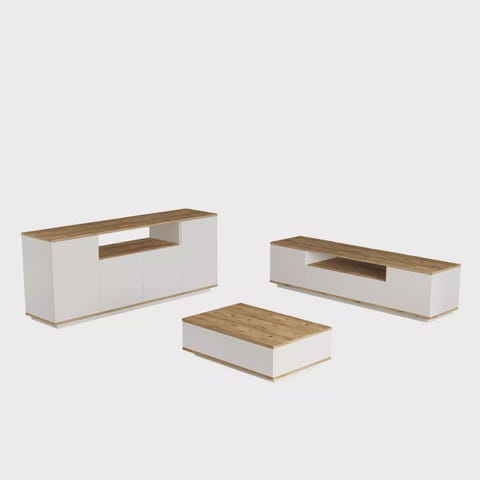 Muunna olohuoneesi ylelliseksi paratiisiksi hienolla olohuoneen kalustesarjalla. Tämä erittäin tarkasti ja yksityiskohtaisesti valmistettu setti on suunniteltu kohottamaan tilaasi ja luomaan lämmin ja kutsuva ilmapiiri. Elevitä asuintilaasiKoe eleganssin ruumiillistuma olohuoneen kalustesarjalla. Rikkaan pähkinäpuun ja runsaan kullan värin yhdistelmä tuo ripauksen hienostuneisuutta mihin tahansa huoneeseen ja muuttaa sen hetkessä mukavuuden ja tyylin tyyssijaksi.Vertaansa vailla oleva kestävyysTämä 100-prosenttisesti melamiinipinnoitetusta lastulevystä valmistettu huonekalusarja on rakennettu kestämään aikaa. 18 mm:n paksuus takaa poikkeuksellisen lujuuden ja vakauden, joten se on luotettava valinta jokapäiväiseen käyttöön. Tyylikäs ja toimiva muotoiluTyylikkäillä metallijaloilla varustettu kalustesarja ei ainoastaan huokuu nykyaikaisuutta, vaan tarjoaa myös erinomaisen tuen ja vakauden. Konsoli, tv-teline ja sohvapöytä on suunniteltu huolellisesti tarjoamaan runsaasti säilytystilaa säilyttäen samalla siistin ja selkeän ulkonäön. Tekniset tiedot:Materiaali: Materiaali: 100 % melamiinipinnoitettu lastulevyPaksuus: 18mmMetallijalat lisäävät vakauttaKonsolin mitat: Leveys: 160 cm, syvyys: 35 cm, korkeus: 80 cm.TV-telineen mitat: 1,5 mm: Leveys: 180 cm, syvyys: 30 cm, korkeus: 50 cm.Sohvapöydän mitat: Leveys: 90 cm, syvyys: 60 cm, korkeus: 40 cm.Uudista olohuoneesi olohuoneen kalustesarjalla ja hemmottele itseäsi tyylin, toimivuuden ja kestävyyden täydellisellä yhdistelmällä. Syleile ylellisyyttä ja luo tila, joka todella kuvastaa ainutlaatuista makuasi ja persoonallisuuttasi. Tilaa nyt ja koe muutos omakohtaisesti!