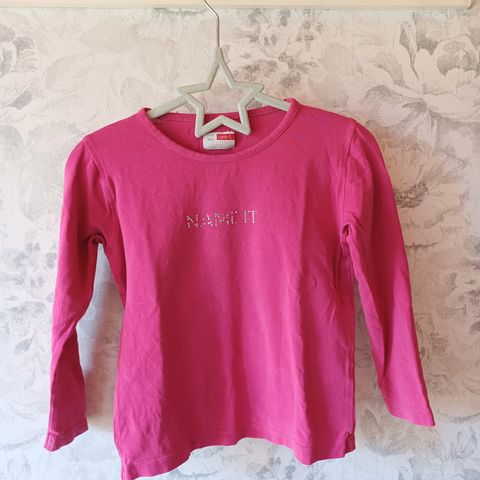 Lasten pitkähihainen paita koossa 104. Paita on vaaleanpunainen ja siinä on edessä painettu kuvitus. Sopii arkipaidaksi lapselle, jonka vaatekoko on noin 104 cm.