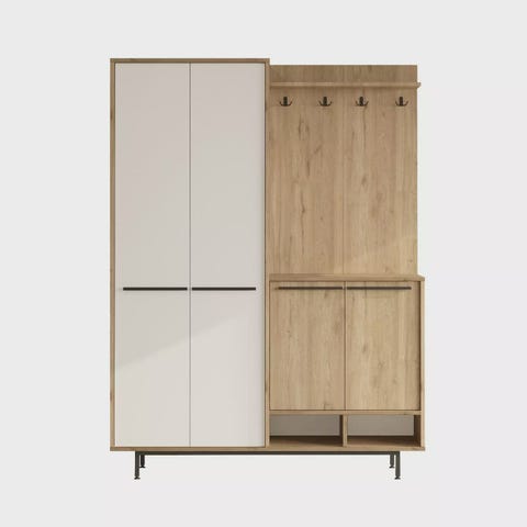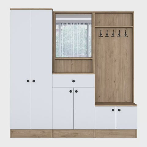 Luo tyylikäs ja toimiva eteinen eteistelineellämmeTee vieraisiin pysyvä vaikutelma heti, kun he astuvat kotiisi eteistelineemme avulla. Tässä upeassa huonekalussa yhdistyvät tyyli ja toiminnallisuus, ja se on täydellinen ratkaisu eteiseen. Nosta kotiasi teollisen tyylikkyyden avullaTyylikkään muotoilunsa ja teollisen inspiroiman konseptinsa ansiosta eteistelineemme tuo ripauksen eleganssia mihin tahansa tilaan. Metallijalkojen, -kahvojen ja -ripustimien yhdistelmä 100-prosenttisesti melamiinipinnoitetun lastulevyn kanssa luo ainutlaatuisen ja modernin ilmeen, joka kohottaa välittömästi kotisi tyyliä.Pysy järjestyksessä runsaan säilytystilan avullaSano hyvästit sotkuisille eteisille ja tervehdi järjestäytynyttä autuutta. Eteistelineessämme on lukuisia hyllyjä, jotka tarjoavat runsaasti säilytystilaa takkeillesi, hatuille, laukuille ja muille välttämättömille tavaroille. Pidä kaikki käden ulottuvilla ja siististi järjestyksessä, jolloin päivittäiset rutiinit sujuvat vaivattomasti. Monipuolinen ja tilaa säästävä muotoiluMitoiltaan 120 cm leveä, 200 cm korkea ja 35 cm syvä eteistelineemme on suunniteltu sopimaan täydellisesti mihin tahansa eteiseen tai eteiseen. Sen kompakti koko takaa, ettei se vie liikaa tilaa, mutta tarjoaa silti runsaasti säilytysmahdollisuuksia. Lisäksi se voidaan helposti kiinnittää seinään vakauden ja turvallisuuden lisäämiseksi. Tekniset tiedot:Tuotetyyppi: Tuotenro: EteistelineMateriaali: Materiaali: 100 % melamiinipinnoitettu lastulevyPaksuus: 18 mmMetallinen jalka, kahva ja ripustin kestävyyden takaamiseksi.Leveys: 120 cmKorkeus: 200 cmSyvyys: 35 cmVäri: pähkinäKonsepti: TeollinenMuunna eteisesi tyylikkääksi ja järjestetyksi tilaksi eteistelineemme avulla. Älä missaa tätä tilaisuutta lisätä kotiisi ripauksen eleganssia ja toiminnallisuutta. Tilaa nyt ja koe ero, jonka se voi tehdä jokapäiväiseen elämääsi.