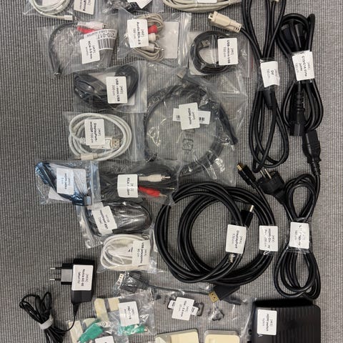 Sekalainen tietokone- ja AV-kaapelilajitelma. Kokoelmassa on useita erilaisia virtajohtoja (mm. C13-tyyppisiä), VGA-kaapeleita sekä muita tietokone- ja AV-laitteisiin soveltuvia johtoja. Kaapelit on pakattu erillisiin pusseihin, joissa on pituus- ja tyyppimerkinnät. Soveltuu esimerkiksi tietokoneiden, näyttöjen ja muiden oheislaitteiden kytkentään sekä varakaapeleiksi.