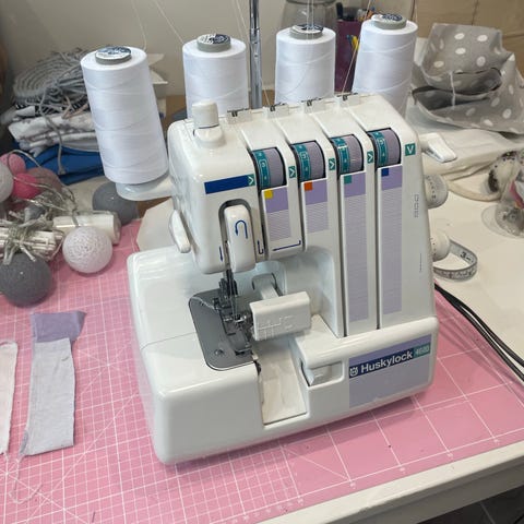 Huollettu saumuri. Tekee kaunista tikkiä ja muutenkin hyvässä kunnossa. Mukaan ohjekirja ja lankoja ym.Voin myös postittaa ostaja maksaa postikulut