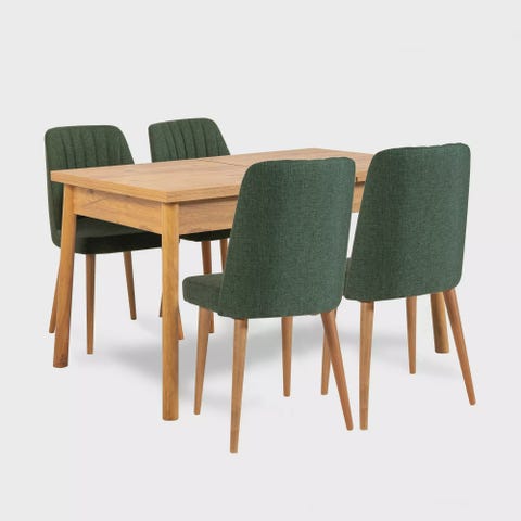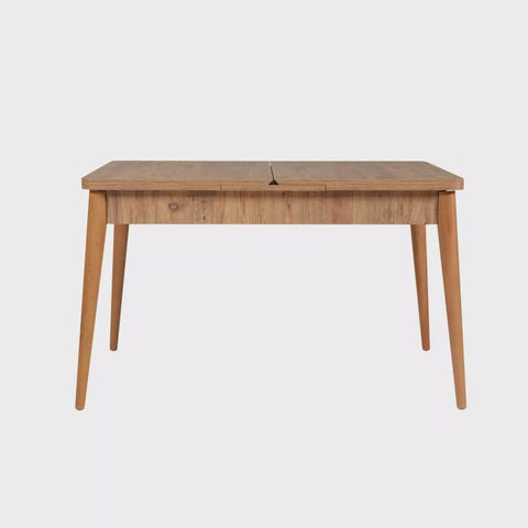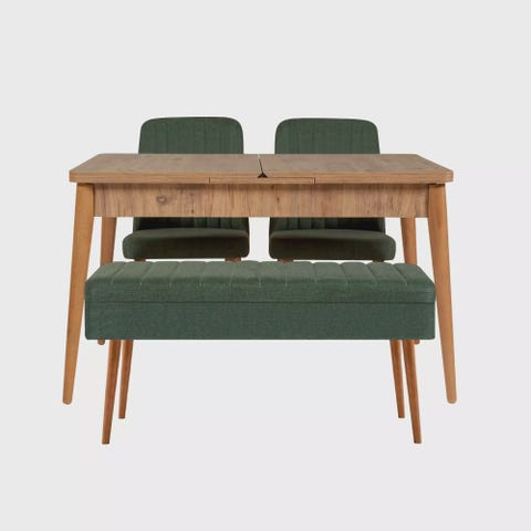 Koe täydellinen yhdistelmä tyyliä ja toiminnallisuutta laajennettavan ruokapöydän ja tuolien sarjan avulla. Tämä 6-osainen setti on suunniteltu kohottamaan ruokailutilaasi ja luomaan unohtumattomia hetkiä rakkaidesi kanssa. Vapauta ruokailutilasi kauneusModernin ja uudenlaisen muotoilunsa ansiosta tämä ruokailusetti tuo vaivattomasti ripauksen eleganssia mihin tahansa huoneeseen. Atlantin männyn ja harmaan värin yhdistelmä luo upean visuaalisen kontrastin, joka saa vieraasi hämmästymään. Piditpä sitten maalaismaisesta, skandinaavisesta tai maalaishenkisestä estetiikasta, tämä setti on tarpeeksi monipuolinen täydentämään mitä tahansa sisustustyyliä.Voittamaton kestävyys ja mukavuusTämä 100 % melamiinipinnoitetusta lastulevystä valmistettu ruokailusetti on tehty kestämään. 18 mm:n paksuus takaa tukevuuden ja kestävyyden, kun taas puiset jalat tuovat ripauksen lämpöä ja hienostuneisuutta. Tuoleissa ja penkissä on metallirunko ja 100 % samettivaahtomuovikangas, jotka tarjoavat vertaansa vailla olevaa mukavuutta pitkien aterioiden ja kokoontumisten aikana. Joustava ja laajennettavaLaajennettavan ruokapöytämme ansiosta voit helposti majoittaa ylimääräisiä vieraita. Pöytä laajenee yksinkertaisella säädöllä 120 cm:stä 153 cm:iin, jolloin kaikilla on runsaasti tilaa ruokailla mukavasti. Tämän ominaisuuden ansiosta se sopii erinomaisesti sekä intiimeihin illallisiin että suurempiin kokouksiin. Tekniset tiedot:Materiaali: Materiaali: 100 % melamiinipinnoitettu lastulevyPaksuus: 18mmPöydän leveys: 120cm (153cm pidennettynä).Pöydän korkeus: 77cmPöydän syvyys: 75cmTuolirunko: MetalliTuolin kangas: 100% samettivaahtoTuolin leveys: 47cmTuolin korkeus: 90cmTuolin istuinkorkeus: 49cmPenkin runko: MetalliPenkin kangas: 100% samettivaahtoPenkin leveys: 100cmPenkin korkeus: 48cmPenkin syvyys: 39cmVäri: Atlantin mänty ja harmaa.