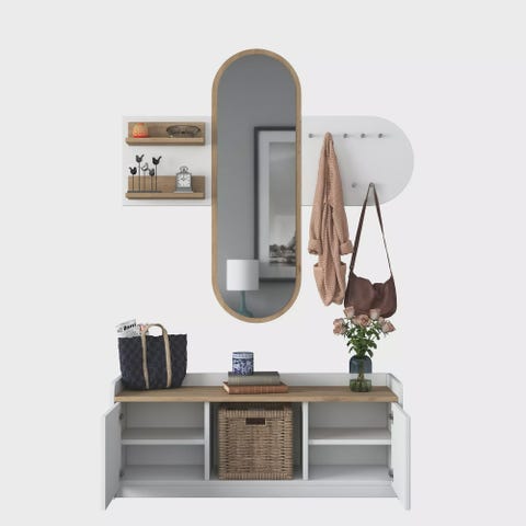 Transformoi eteisesi tyylikkäällä ja toimivalla eteistelineelläTee vieraisiin pysyvä vaikutelma, kun he astuvat kotiisi hienolla eteistelineellämme. Tämä äärimmäisen tarkasti ja yksityiskohtiin paneutuen valmistettu esine on suunniteltu parantamaan eteisesi kauneutta ja toimivuutta. Nosta kotisi sisustusta tyylikkäästiRikkaan pähkinäpuun ja puhtaan valkoisen värin yhdistelmä antaa tälle eteistelineelle ajattoman viehätyksen, joka täydentää vaivattomasti mitä tahansa sisustustyyliä. Sen tyylikäs ja moderni muotoilu tuo tilaan ripauksen eleganssia, mikä tekee siitä täydellisen lisän kotiisi. Pysy järjestäytyneenä ja sotkuisuudesta vapaanaRunsaan säilytystilan ansiosta eteistelineemme auttaa sinua pitämään eteisesi siistinä ja järjestyksessä. Useat hyllyt ja lokerot tarjoavat erityisen paikan takkeillesi, hatuille, huiveille ja muille välttämättömille tarvikkeille, varmistaen, että kaikki on helposti ulottuvillasi silloin, kun tarvitset niitä. Rakennettu kestämään, suunniteltu mukavuuttasi vartenYmmärrämme kestävyyden ja mukavuuden merkityksen huonekaluissa, minkä vuoksi eteistelineemme on valmistettu 100-prosenttisesti melamiinipinnoitetusta e1-laatuisesta lastulevystä. Tämä takaa sen pitkäikäisyyden ja kulutuskestävyyden, mikä tekee siitä luotettavan kappaleen vuosiksi eteenpäin. Tekniset tiedot:Materiaali: materiaali: 100 % melamiinipinnoitettua E1-laatuista lastulevyä.Paksuus: 18 mmLeveys: 180 cmKorkeus: 198. 6 cmSyvyys: 37,5 cmVäri: Pähkinä ja valkoinenSijoita eteistelineeseemme jo tänään ja koe tyylin ja toiminnallisuuden täydellinen yhdistelmä. Muunna eteisesi viihtyisäksi tilaksi, joka kuvastaa ainutlaatuista makuasi ja persoonallisuuttasi. Tilaa nyt ja nauti mukavuudesta ja tyylikkyydestä, jonka tämä poikkeuksellinen esine tuo kotiisi.