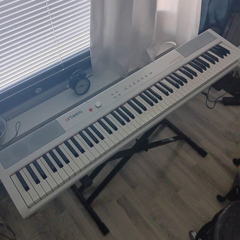 Lasten sähköpiano, jossa on sisäänrakennetut kaiuttimet molemmissa päissä. Toimii paristoilla, paristokotelo sijaitsee pohjassa. Sopii lasten musiikkileikkeihin ja äänten sekä sävelten harjoitteluun.