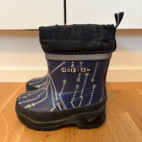 Vuorelliset lasten kumisaappaat, koko 22. Saappaissa on kumipintainen varsi, kiristettävä varrensuu sekä heijastinyksityiskohtia.