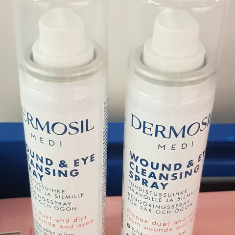 Dermosil Medi Burn treatment gel. Tuote on tarkoitettu ihon paikalliseen käsittelyyn, esimerkiksi lievien palovammojen tai ihon ärsytystilojen rauhoittamiseen valmistajan ohjeiden mukaisesti. Valkoinen spraypullo, jossa suihkutettava annostelija helppoa käyttöä varten.