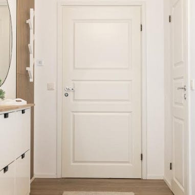 Vanha klassikko valkoinen sisäovi, jossa neljä suorakulmaista peiliä. Ovien kunto on pääsääntöisesti hyvä paitsi yksi ovista on ollut kylpyhuoneen ovena. Tästä kuvat.