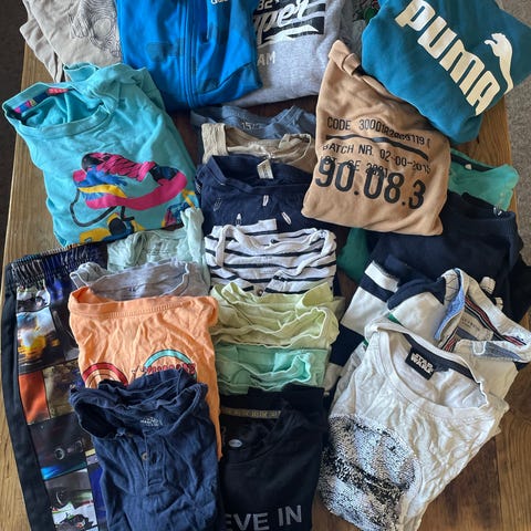Pojan vaatepaketti pääosin kokoa 134, mutta jokunen 128 ja 140 mukana.