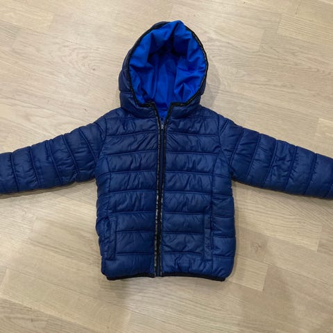 Tummansininen hyväkuntoinen kevyttoppatakki, koko 100, menee 98/104 kokoa käyttävälle. Olka-helma 44 cm, kainalo-hiha 27 cm. Perus siisti, ei reikiä tai tahroja. Keskiosa tekstiilikarvaa, hihoissa liukas vuori. Vetoketju toimii hyvin. Pajuluomalta tai postittaessa kulut ostajalle.