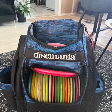 Myydään frisbeegolf setti, johon kuuluu 11 kiekkoa sekä reppu.
