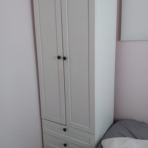 Myydään valkoinen Ikean Kleppstad vaatekaappi, Sisällä molemmissa kaapeissa kolme hyllyä. Kaapin ala reunassa yksi kiinnike tullut läpi asentaessa (vasen alakulma, ei näy koska kaappia vasten. Ollut lastenhuoneessa lelukaappina eli on kulumaa, mutta yleisilme siisti kuitenkin. Vain nouto ja käteinen. Omat kantajat, talossa hissi. En pura kaappia. Edessä tarralla koukku, jonka saa pois.