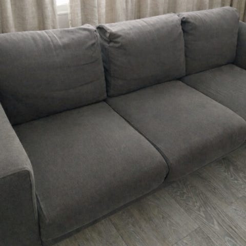 Sohva. Kangas kissa raapinut rikki. Muuten ehjä. Tyynyjen muoto vielä tallessa. Kangas on viimeks pesty kuukausi sitten. Ei hajuja. Kissatalous.