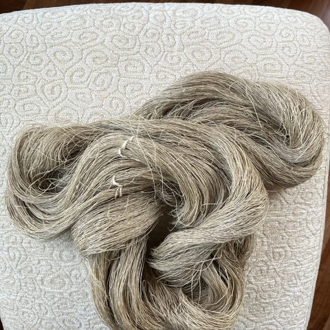 Vihreä vyyhti pellavaa ja nuo ohuemmat myös pellavaa. Paksummat juuttia/pellavaa.