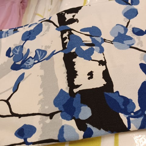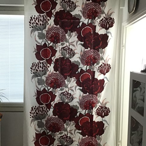 Myytävänä myös saman sarjan verhot valkoisella pohjavärillä.