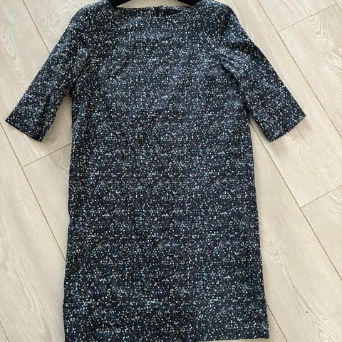 COS naisten arkimekko, koko 38. Mekko on valmistettu polyesteristä ja siinä on monivärinen, graafinen kuosi tummalla pohjalla sekä yksivärinen alaosa. Lyhyet hihat ja suora malli tekevät mekosta helppokäyttöisen arkeen. Takasaumassa on vetoketju. Kainalo-kainalo mitta 49 cm, olka-helma pituus 89 cm.