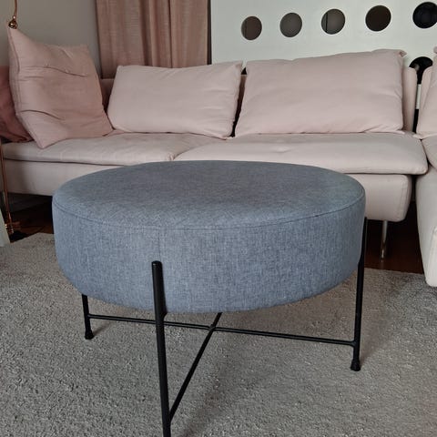 Punainen korkealla selkänojalla ja matalalla päänalusella oleva pyörivä Iskun nojatuoli (korkeus 107 cm, leveys 62 cm ja syvyys n 80 cm) ja rahi (50*55, korkeus 40 cm). Helppo pitää puhtaana.