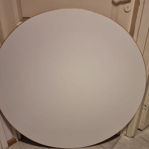 Artekin 90A pöytä, halkaisija 100cm. Pöydän pinta valkoista laminaattia. Ostettu uutena 2023.