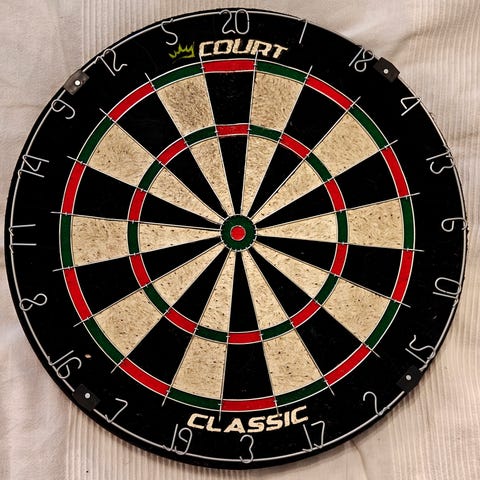 Taustan koko n.80x100cm. Tehty pahvista ja verhoilumatosta. Ohi lentävät tikat jäävät tähän ihan hyvin kiinni. Itse tausta ei ole kovinkaan kaunis taidonnäyte. Vaatii ehkä jatkojalostusta.