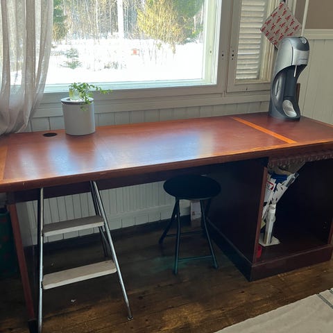 Hyvässä kunnossa oleva työpöytä. Ylin vetolaatikko vaatii hieman puuliimaa, mutta toimii. Painava, omat kantajat mukaan. Nouto Revonlahdelta. 45€