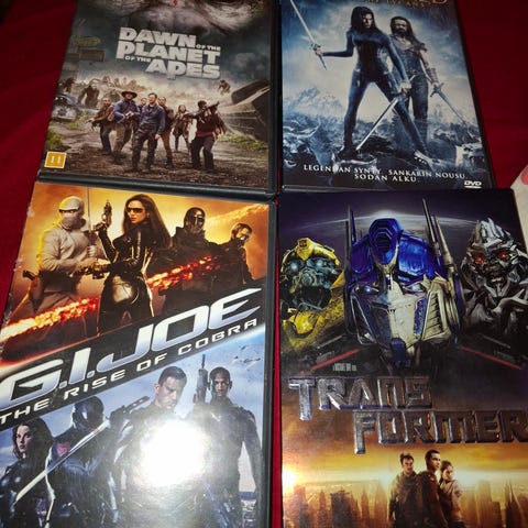 Independence Day/Day After Tomorrow, Hamburger Hill, Aikakone ja Matka maan keskipisteeseen. Kaikki elokuvat ovat DVD-levyillä alkuperäisissä koteloissaan. Sopii DVD-soittimelle ja elokuvien keräilyyn tai katseluun kotona. Kielet, tekstitykset ja ikärajat ilmenevät koteloiden takakansista.