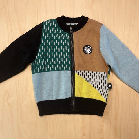 Muumi villatakki noin koossa 74-86. Tupsuhuppu ja puiset napit.