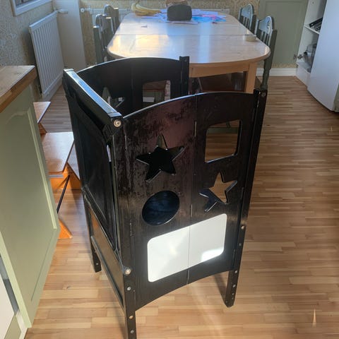 Oppimistorni ollut meillä kovassa käytössä jo vuoden ikäisestä asti, pääsee helposti ja turvallisemmin mukaan ruuan laitto ja keittiö puuhiin, kun ei helposti pääse horjahtamaan alas korokkeelta.