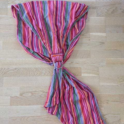 Käsinkudottu Amazonas rengasliina (Ring sling, ringsling), väreinä perussininen ja tumma mustikka. Pituus 2,3m. Pesty aina käsin, ei repeämiä, renkaat kunnossa. Ollut todella näppärä sekä vauvan että taaperon kanssa!