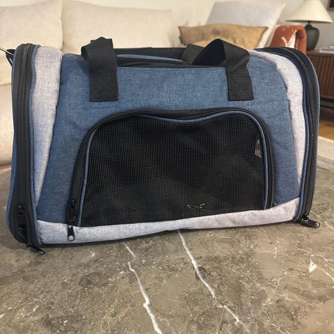 Musta, nahkainen lemmikinkuljetuslaukku pienelle koiralle tai kissalle. Laukussa on kantokahvat ja vetoketjusuljenta ylhäällä. Sivuilta löytyy verkkopaneelit ilmanvaihtoa ja näkyvyyttä varten. Sisäpuoli on vaaleaa, sileää kangasta. Laukku sopii pienen lemmikin kuljettamiseen esimerkiksi matkalla tai eläinlääkäriin. Pieni koira mahtuu laukkuun makuulleen. 40 cm x 26 cm (syvyys) x 30 cm (korkeus)