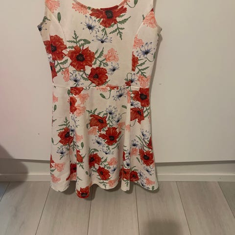 Naisten kukkamekko, koko L. Hihaton malli, jossa on tummapohjainen kangas ja suuret kukkakuviot vaaleissa sävyissä. Mekossa on vyötäröltä levenevä helma ja takana vetoketju. Sopii arki- ja juhlakäyttöön vuodenajasta riippuen yhdistettynä esimerkiksi neuletakkiin tai juhlakenkiin.