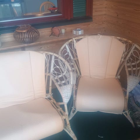 Polyrottinkinen kaksiosainen sohva, jossa harmaa punosrunko ja neljä irrotettavaa vaaleanharmaata istuin- ja selkätyynyä. Sohva soveltuu parvekkeelle, terassille tai muuhun ulkotilaan. Istuinosat muodostavat kahden hengen istuinpaikan, ja käsinojat ovat korimallista punosta. Tyynyjen päälliset vaikuttavat olevan tekstiilimateriaalia. Rakenne on kulmamallinen, ja sohva sijoittuu seinää vasten. Tuote on tarkoitettu ulkokäyttöön, mutta sitä voi käyttää myös lasitetulla parvekkeella tai sisätilassa.