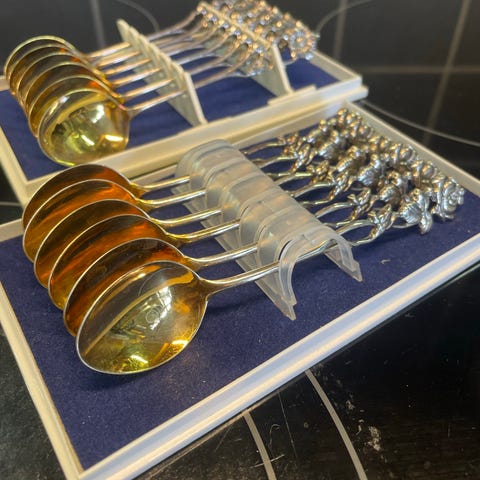 Windsor lusikka, emali-hopea/hopeoitu ja Leuven lusikka emali-hopea/hopeoitu 50- luvulta, pituus 12 ja 11,5 cm, tukevia, uudenveroisia, yhteishinta ilmoituksessa