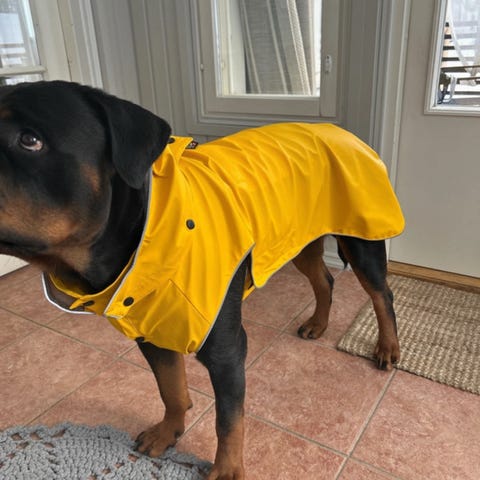 Rukka koiran sadeviitta, koko 60 cm. Punainen sadeviitta, jossa musta verkkovuori. Materiaali pääosin polyesteriä. Viitassa on säätöremmit ja soljet kiinnitystä varten sekä heijastintereitä näkyvyyden parantamiseksi. Mukana tulee säilytyspussi, jossa koko 60 merkittynä. Sopii koiralle sateisille ja kosteille keleille suojaamaan selkää ja vartaloa.