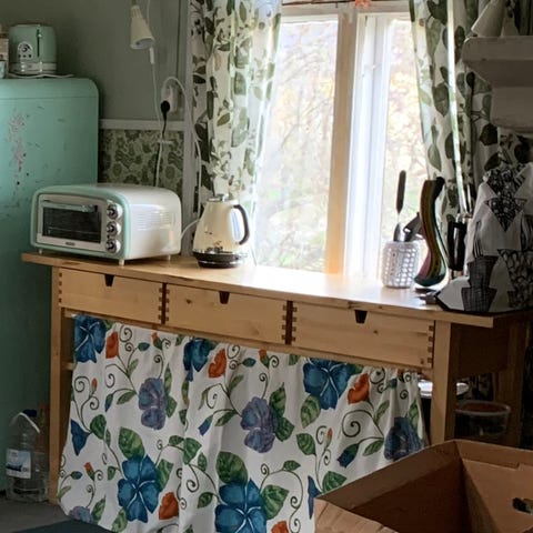 Itse maalattu valkoiseksi Osmo puuvahalla. Ylätaso työskentelyyn tai tarjoiluun, kaksi avohyllyä sekä kaksi vetolaatikkoa pientarvikkeille. Toisessa päädyssä metallinen tanko esimerkiksi pyyhkeelle ja toisessa kaksi koukkua. Sopii keittiöön lisätasoksi ja säilytykseen tai muuhun sisäkäyttöön sivupöytänä.