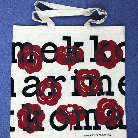 Toisella puolella musta teksti vaalealla pohjalla, toisella puolella uusi kukkakuvio tekstin lisäksi.