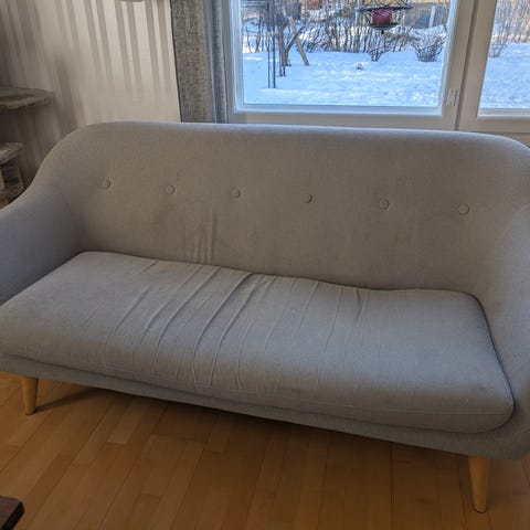 Sohva on hyvässä kunnossa ja kaksi sohvatyynyn vetoketjua on rikki, mutta eivät näy. Siinä on joitakin paikkoja. Hyvässä kunnossa ja mukava. Meillä on kissa talossamme.