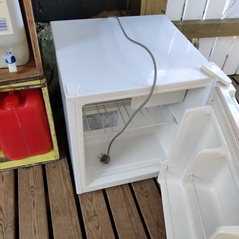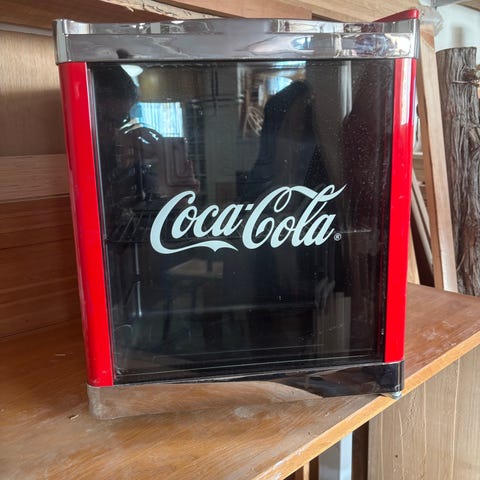 Suloinen punainen Coca-Cola jääkaappi. Termostaatti vaatii vaihtoa/ korjausta tai voit antaa lasten leikkeihin tai säilyttää siinä muuta kuin jäähdytettäviä tuotteita.