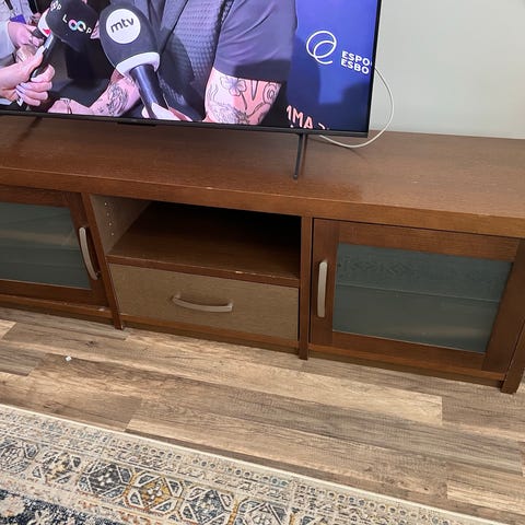 Massiivipuinen, aikaa nähnyt tv-taso/hylly. Tästä saa värkkäämällä vaikka kenkähyllyn. Ilmaiseksi nopeimmalle hakijalle.