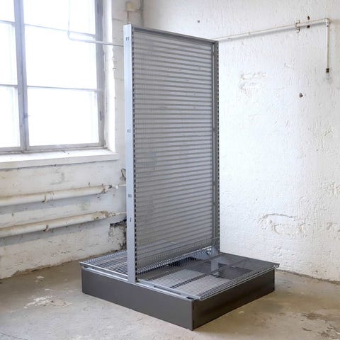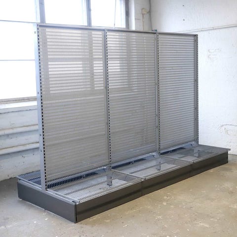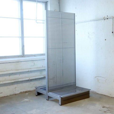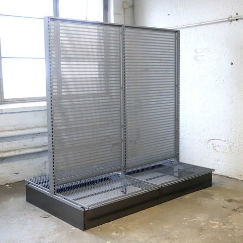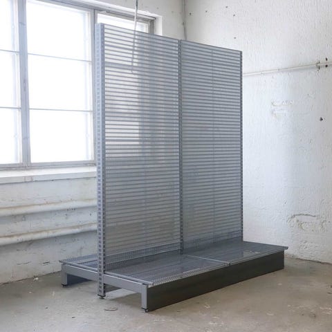 Korkeus 212 cm, leveys 273cm, syvyys 113cm. Perusosa, sisältää 4 T-jalkaa, 6 taustalevyä kannakkeineen, 6 lankakorihyllyä kannakkeineen.