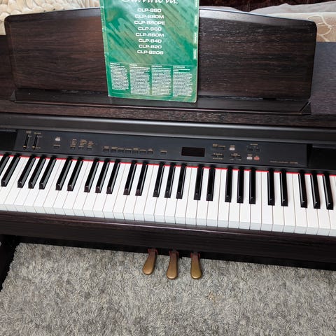 Yamaha Clavinova digitaalipiano (CLP-840) tummanruskealla puuviimeistelyllä. Soittimessa on täysikokoinen koskettimisto, kolme poljinta sekä sisäänrakennetut kaiuttimet.