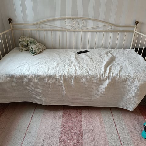 Levitettävä metallisänky, ollut parvekkeella pari kesää. Itse en ole käyttänyt levitettävää osaa, siihen kuuluvat osat pitäisi olla tallella jossain. Sängyn "nupit" ovat hieman pudottaneet maalia pinnasta (näkyy kuvassa). Sängyn saa muistaakseni muutamaan osaan, mutta ei mahdu henkilöauton välttämättä siltikään. Patja noin 10-15cm paksu, jossa jouset sisällä. Pieni tahra kankaassa, en tiedä mistä tullut. Patja on kelmutettu valmiiksi kuljetusta varten.
