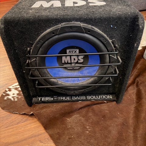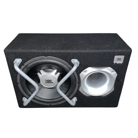 DLS subwoofer kotelolla. Subwoofer on asennettu mustaan, verhoiltuun koteloon, jossa on liitinpaneeli takasivulla. Sopii esimerkiksi auton tai kotiteatterin bassokaiuttimeksi järjestelmiin, joissa tarvitaan erillinen subwoofer kaiutinkotelossa.
