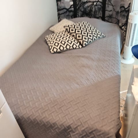 Jysk 120cm sänky runkopatjalla. Sängyssä on tummanharmaa runko ja vaalea päällinen. Sopii yhden hengen vuoteeksi makuuhuoneeseen tai vierashuoneeseen. Kuvissa näkyy patjan ja rungon yksityiskohtia sekä pinnan kuntoa. Ei toimitusta, vain nouto ja omat kantajat mukaan.