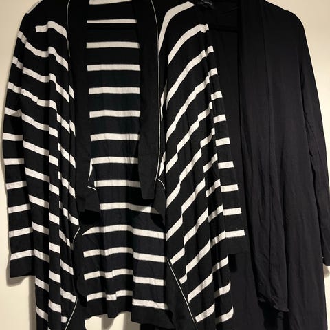 2. kuva: Musta-valko raidallinen S koon Seppälän ohut neuletakki on pitämätön ja kunnoltaan uudenveroinen. Viskoosin seassa on 20% polyamidia.